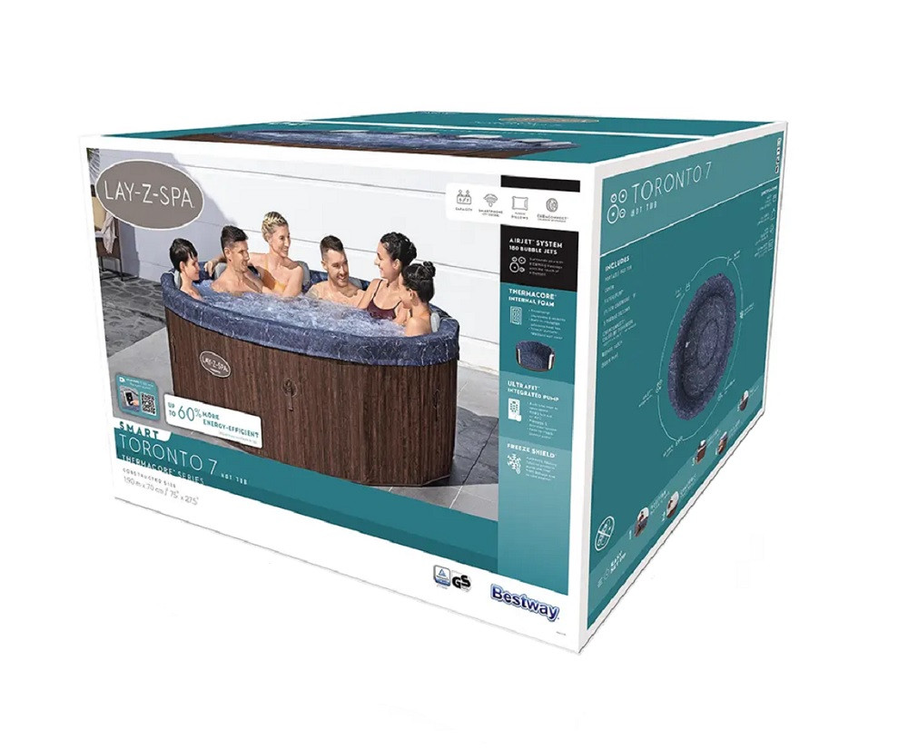- A Freeze Shield® technológiának köszönhetően az automata fűtési funkció meggátolja a víz megfagyását és a masszázs károsodását, így télen is használható. 6°C-on bekapcsol és 10°C-on kikapcsol, így télen-nyáron használható (-10°C-os külső környezeti hőmérséklet alatt nem ajánlott a használata)- A Tritech® anyagból készült pezsgőfürdő külső felülete tartós szilárdságot és szerkezeti stabilitást ad- A ThermaCore™ Rigid Foam Panels (kemény habpanel) technológiával készült szerkezet szilárdabb, tartósabb, ami akár 60%-kal energiahatékonyabb, mint egy hagyományos felfújható Spa masszázsmedencék- Sooting Airjet™ rendszer: 180 levegőbefúvó - A medencetestbe beépített praktikus UltraFit™ szivattyú és kezelőpanel helytakarékos megoldást jelent- A ChemConnec®t vegyszeradagoló: belülről csatlakoztatható, belehelyezve a tablettát folyamatosan tiszta vizet biztosít- Felfújható, fűthető 5-7 személyes masszázsmedence- Beépített Wi-Fi modullal, így a Bestway SMARTPHONE APP telefonos applikáción keresztül is bárhonnan vezérelhető- Kezelőpanelen digitális vezérlés, energiatakarékos időzítővel- 40 napra előre beprogramozható- Ülőfelülete: puha és szigetelt- Erős védőtakaró biztonsági csattal- Beépített papírszűrős vízforgató- Teljesítménye: 1325 L/h (50 W)- Vízhőmérséklet: 20 ~ 40 °C- Gyorsfűtő rendszer max. 40 °C (2050 W) 1,1-1,6°C fokkal melegíti a vizet óránként (tájékoztató jellegű táblázat a felfűtési időről)- Üzemi feszültség: 220-240V (50Hz)- Szűrőbetét típusa: VI.- Víztérfogat: 1250 L- Vízkapacitás: 80%- Külső méret: 190 x 70 cm- Belső átmérő: 170 cm - Súlya feltöltve: 1288 kg- Dobozolt méret: 110 x 78 x 78 cm- Nettó súly: 49,27 kg- Bruttó súly: 50,58 kg6001W Toronoto masszázsmedence leírás HUA termék kizárólag a háztartásokban szokásos használatra készült. Ipari és vendéglátóipari célra nem használható.