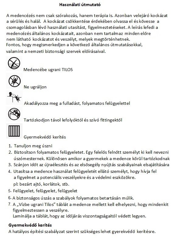 Figyelem! Az úszómedence használata során feltétlenül be kell tartani a kezelési és karbantartási útmutatóban foglalt biztonsági előírásokat. A fulladás és más súlyos sérülés elkerülése érdekében fokozottan ügyeljen az 5 év alatti gyermekek úszómedence-használatára. Biztosítsa a medence biztonságos megközelíthetőségét, és a fürdés alatt tartsa folyamatosan felnőtt felügyelete alatt a gyermekeket.