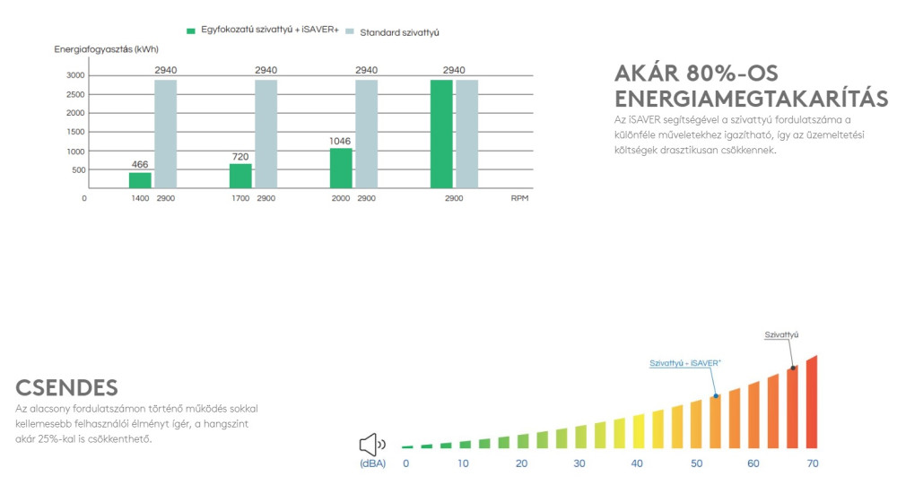 Az iSAVER+ segítségével a szivattyú fordulatszáma beállítható a különböző műveletekhez igazodva, az üzemeltetési költségek drasztikus csökkenését eredményezve