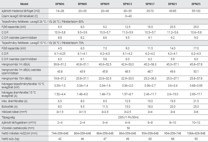 - Levegő 26°C / víz 26°C / Páratartalom 80%: 10,5 kW / COP tényező: 10,5~6,6