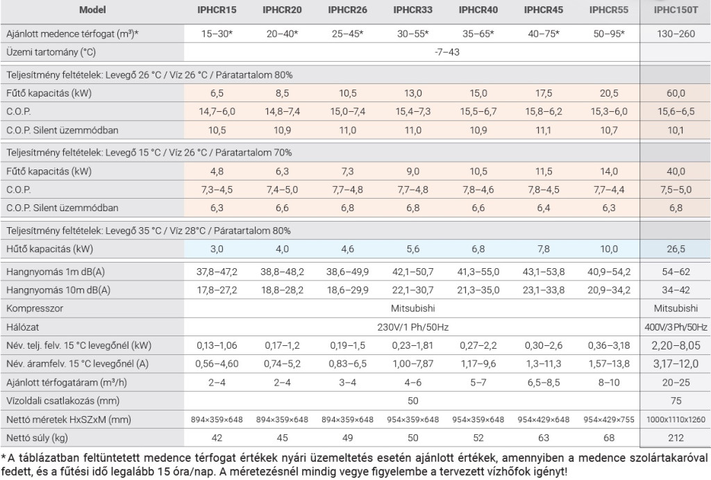 - Levegő 26°C / víz 26°C / Páratartalom 80%: 17,5 kW / COP tényező: 15,8~6,2